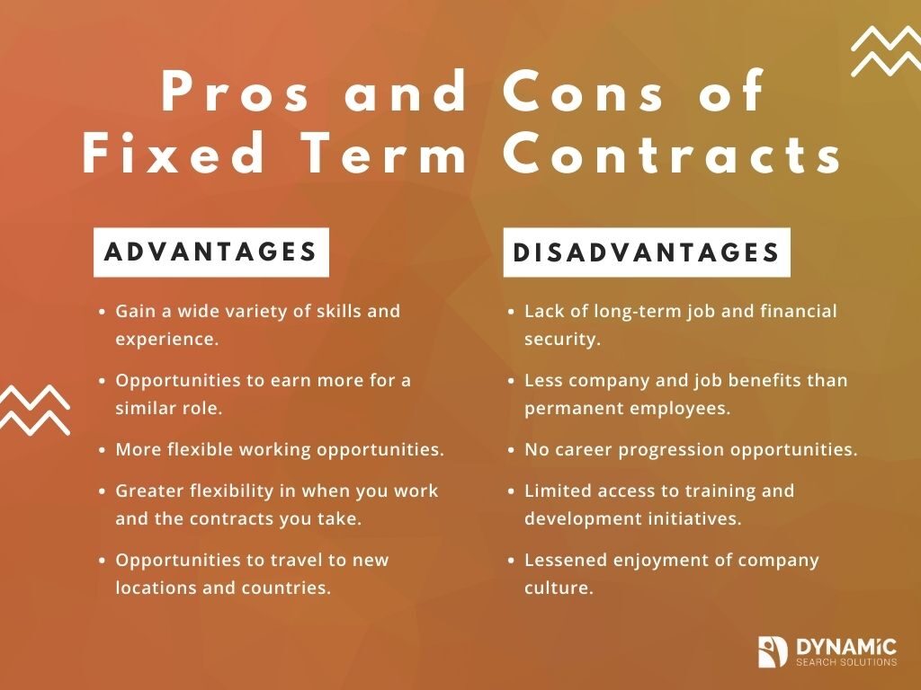 The most obvious, and perhaps the biggest disadvantage to fixed term contract employment, is the lack of job security. Your employment will have a fixed end date. And it can be difficult to find a new contract that starts immediately as your old one ends. Additionally, you may not be as protected as a permanent employee if your contract is terminated early. And you may not have a notice period as long as a permanent employee.